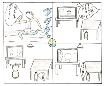 アイデア秀逸。絵も稚拙のようでいて、妙に説得力があります。3コマ目のお母さん、迫力ありますね。手足の動きが逆なのに、それもあまり気になりません。ユニークな作品です。