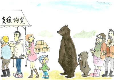 支援物資を受ける行列の中に、熊の親子が…。つまり、熊の親子も被災者の一員であるというヒューマンスティックな絵柄に徹底して欲しかったと思います。熊、人物の表現に一工夫が必要です。
