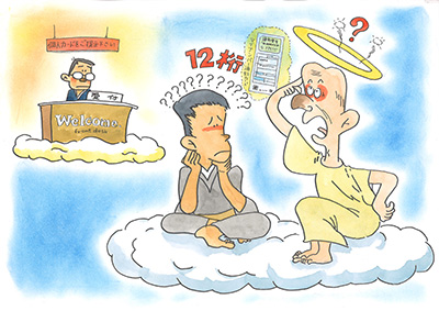 構図も優れていて、昔からある1コマ漫画らしい絵のタッチです。閻魔様ではなく、淡々と事務的な表情の受付が、笑いを誘っていました。