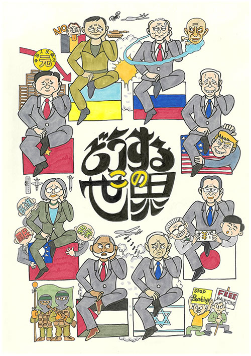 画力、デザイン性が高く、見応えのある作品です。「どうするこの世界」のロゴがドラマのパロディになっており、周りを囲んでいる各国の指導者を見ていると、2023年に起こった出来事を思い出させてくれます。指導者の表情や仕草をじっくり見ると、もっと楽しめる作品となっています。