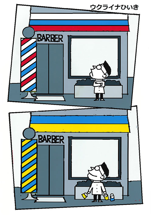 床屋の店主がウクライナひいきでロシアカラーからウクライナカラーに塗り替えた面白さ。戦争の風刺もある。