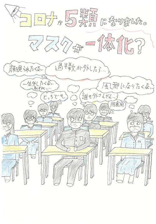 教室でのマスク姿が描かれ、現実もそのままで分かりやすい作品です。コロナ禍の3年間で顔と一体化したマスクに「過半数が外したら…」、「恥ずかしい…」などのこの世代の子の気持ちが良く表れています。