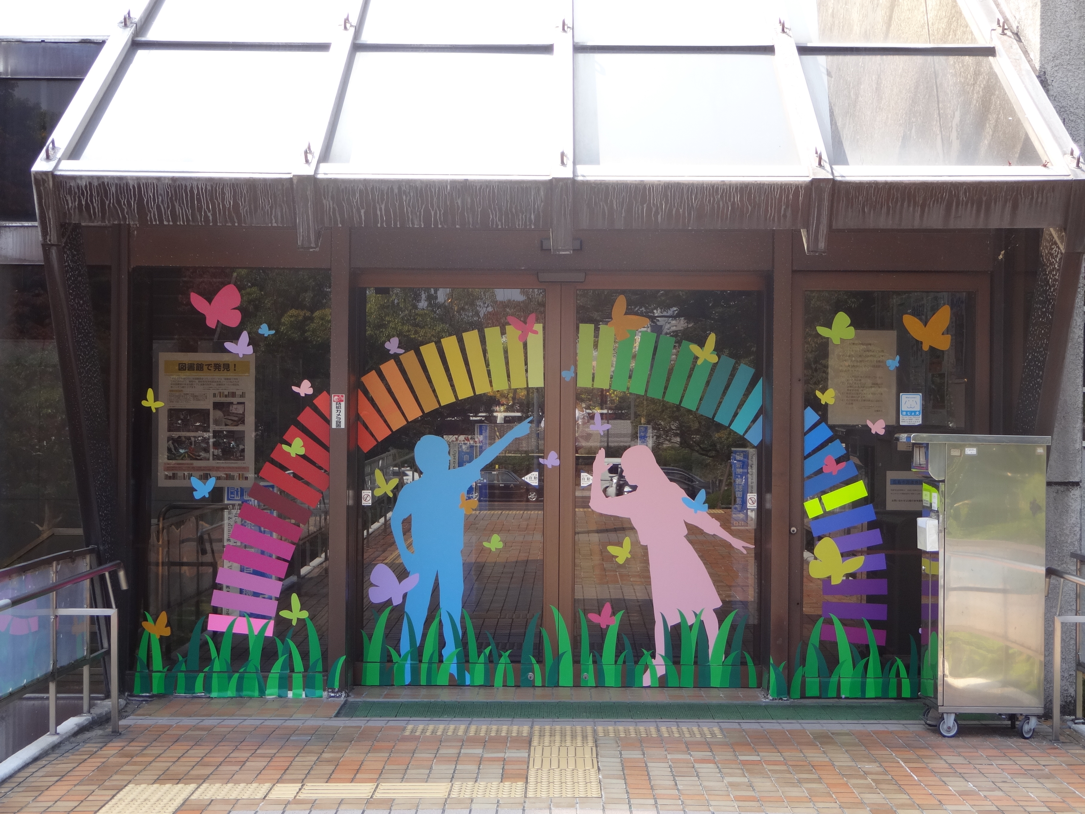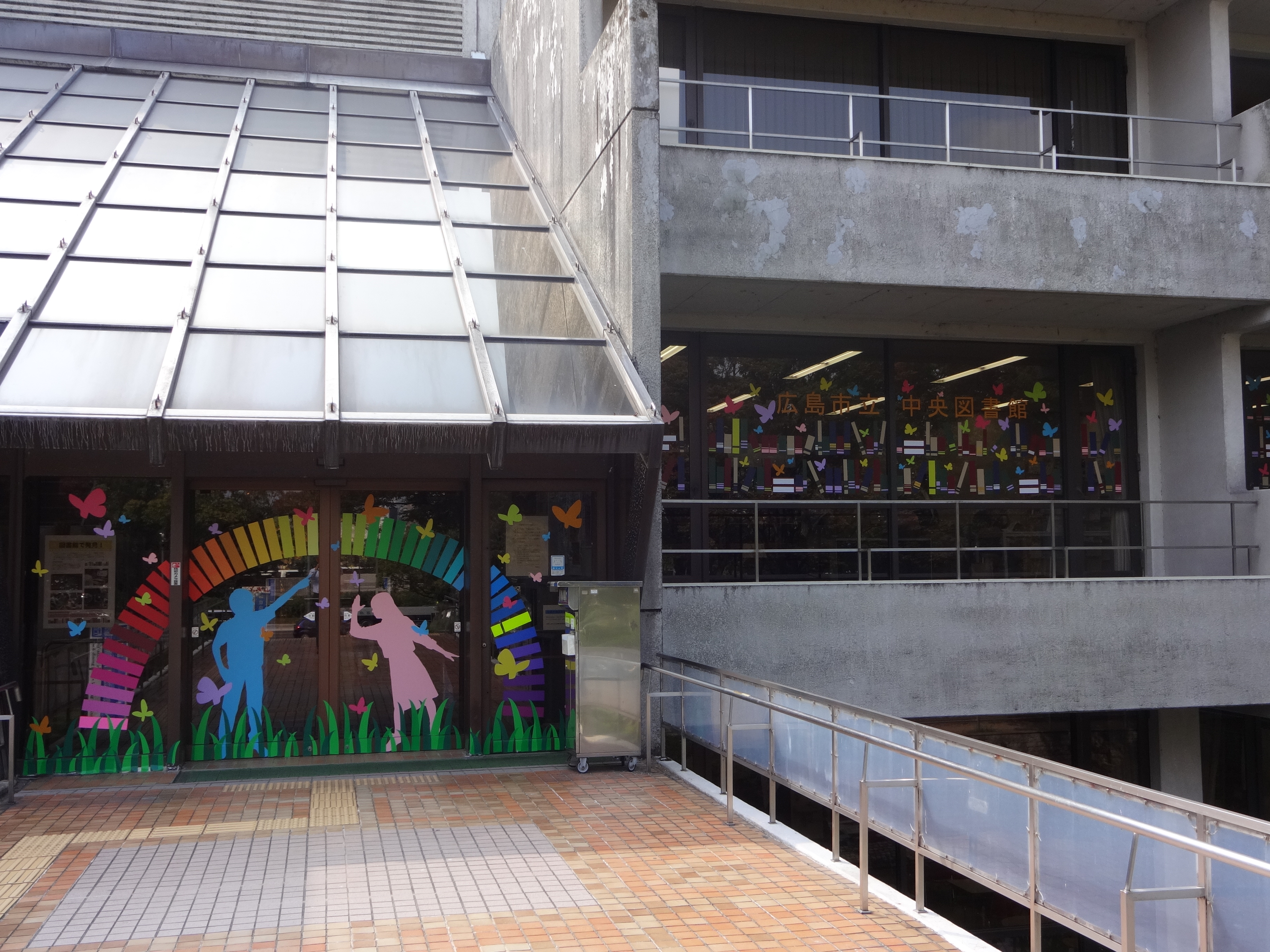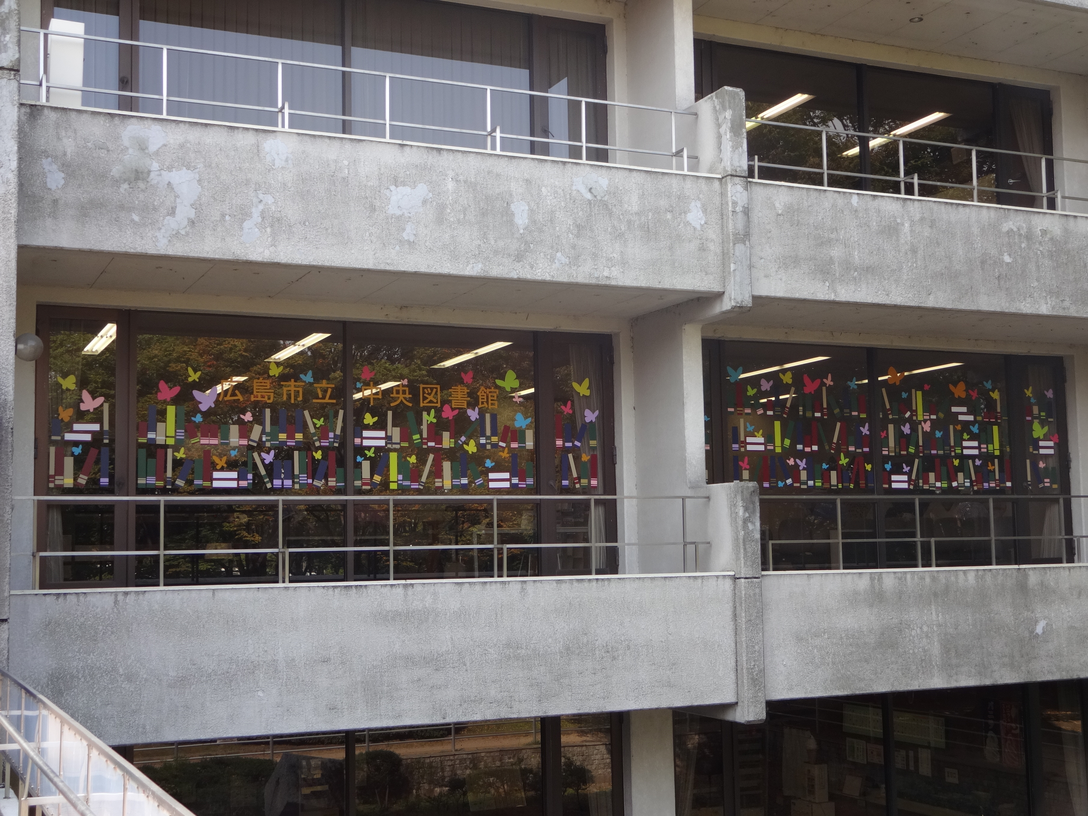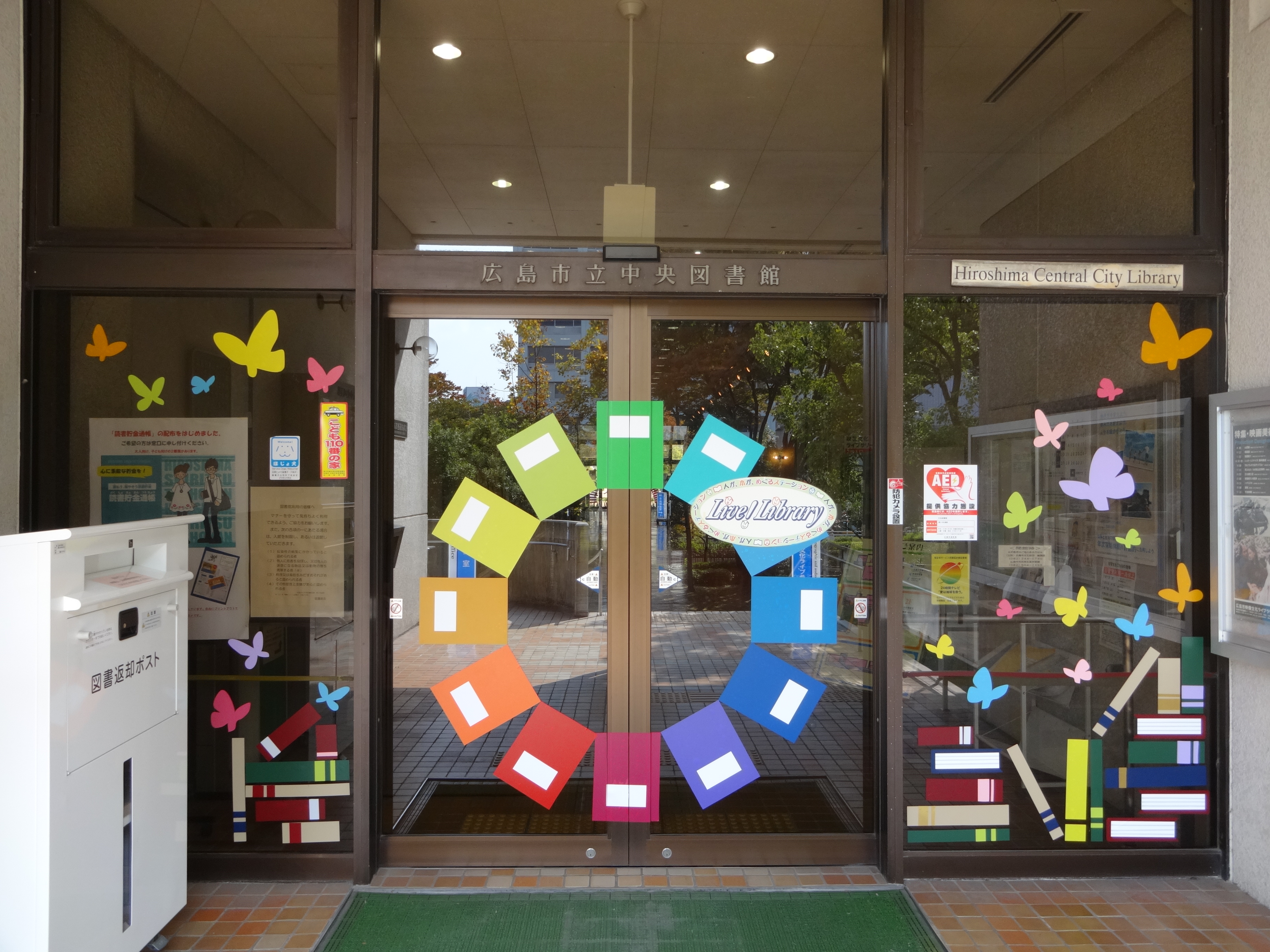 10月24日(土)から11月8日(日)まで開催の「ひろしま図書館まつり」にあわせ、広島市立基町高等学校創造表現コースの生徒達が、中央図書館の南北の玄関口を色とりどりのカッティングシートを使って華やかに装飾しています。