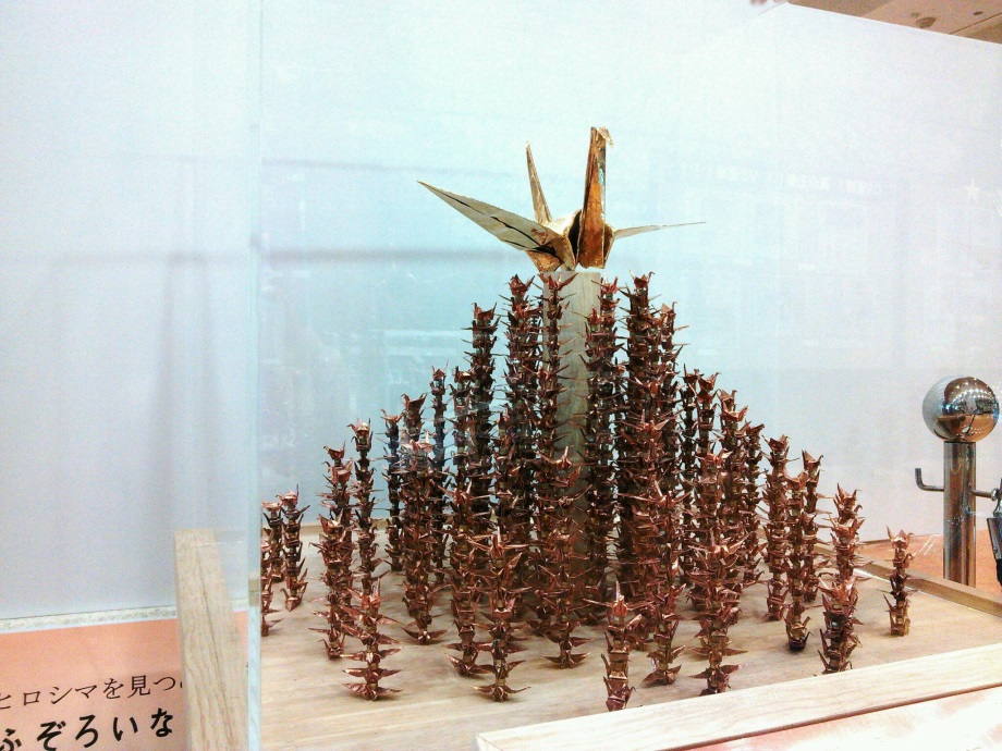 被爆70周年にあたる平成27年には、平和を願う「ヒロシマの心」を伝え核兵器廃絶を目指すことを目的に、2年がかりで千羽鶴にされました。この「銅板千羽鶴」に込めた平和への願いを、広く市民の皆さんや広島を訪れる方々にも共有してもらいたいと、『はだしのゲン』の作者中沢啓治氏の命日である平成27年12月19日、中央図書館にご寄贈いただきました。