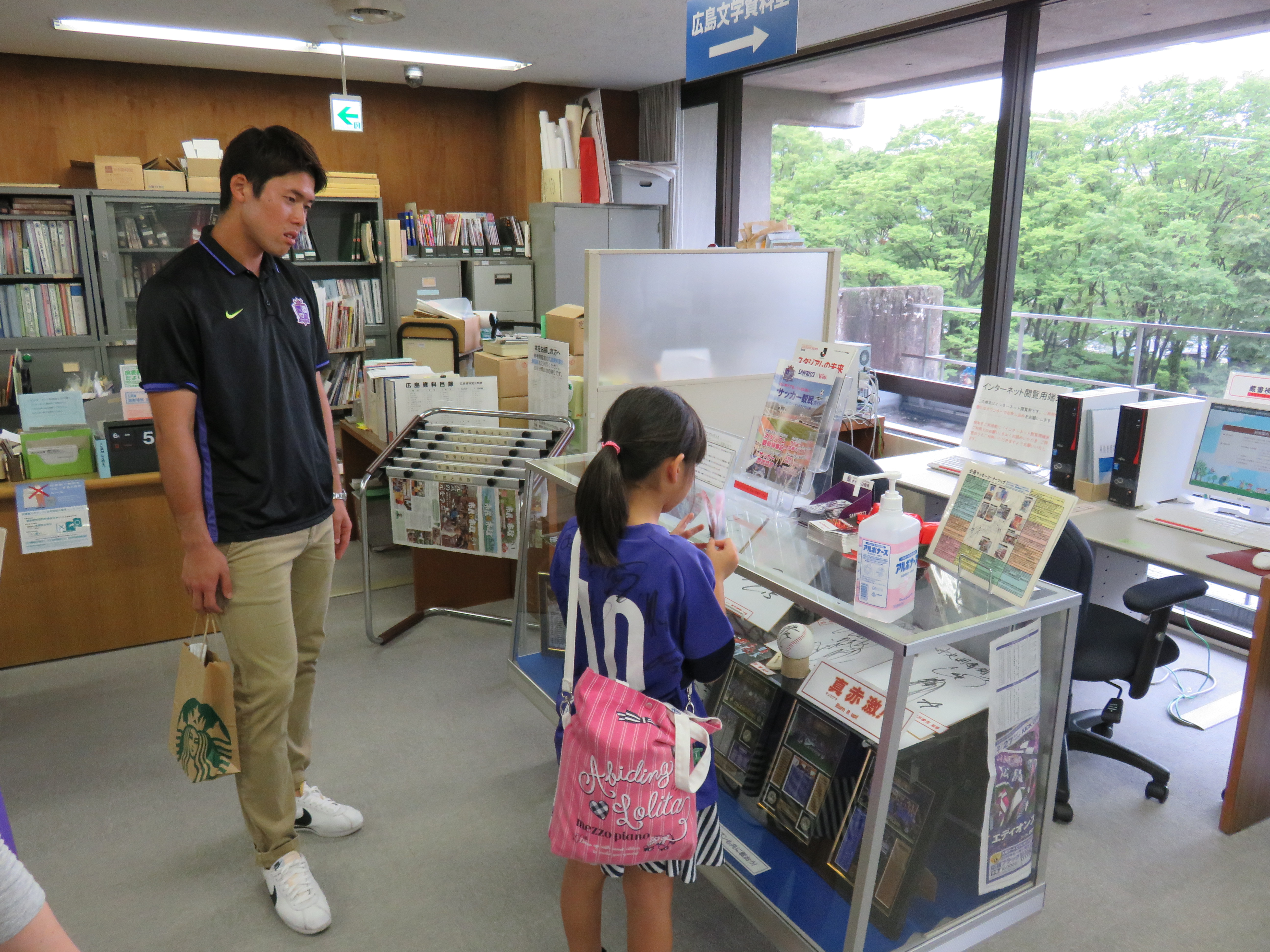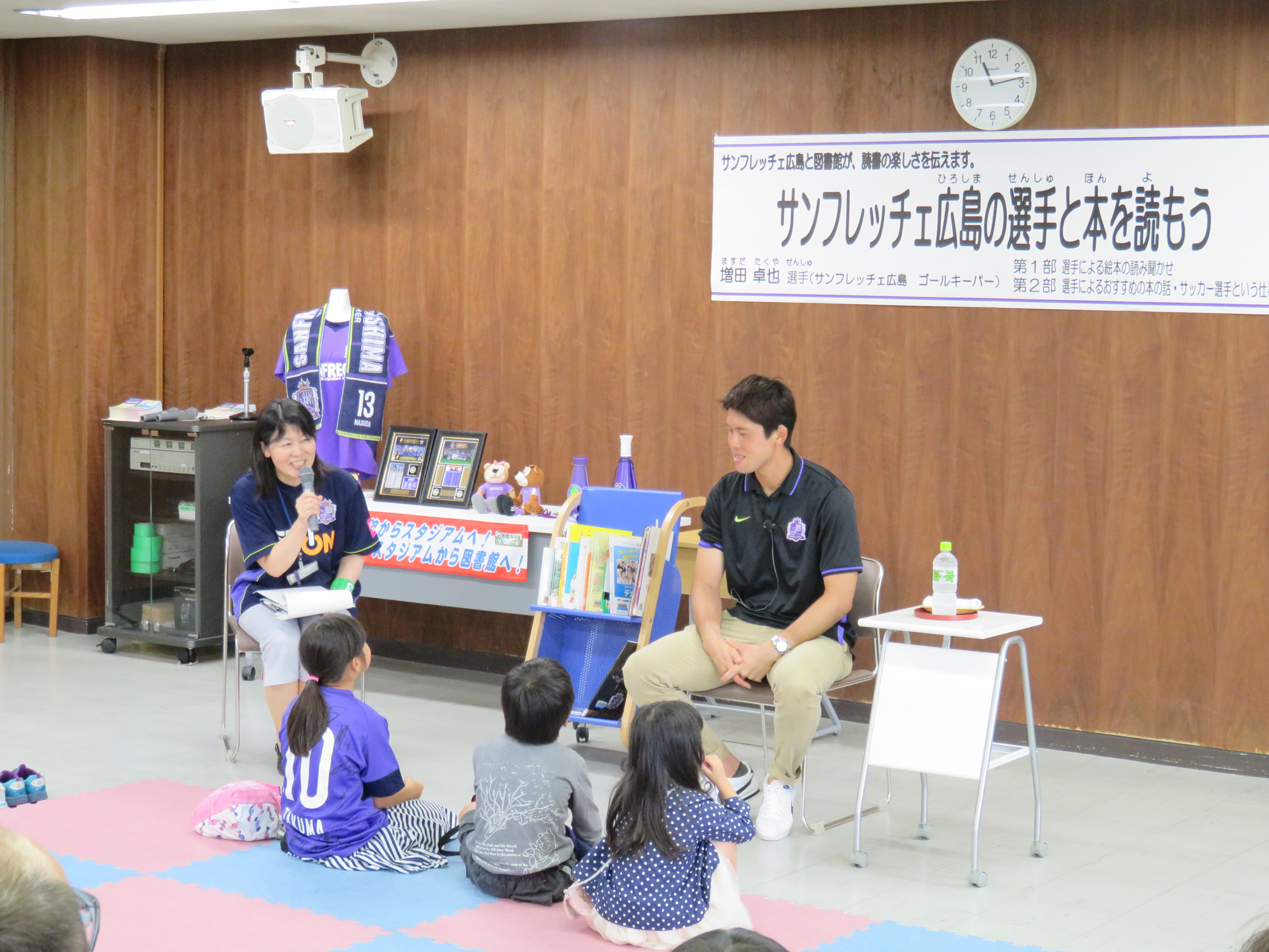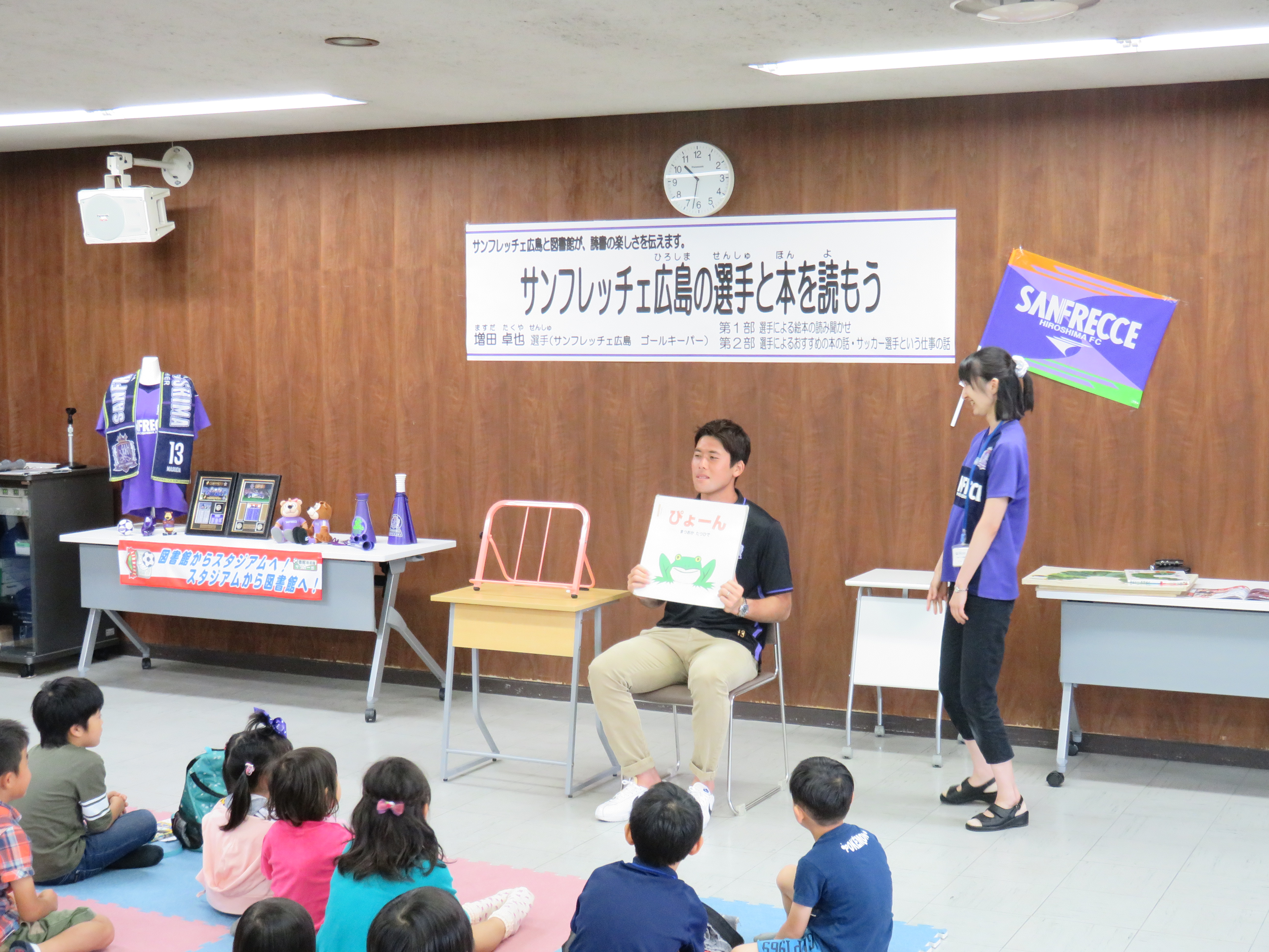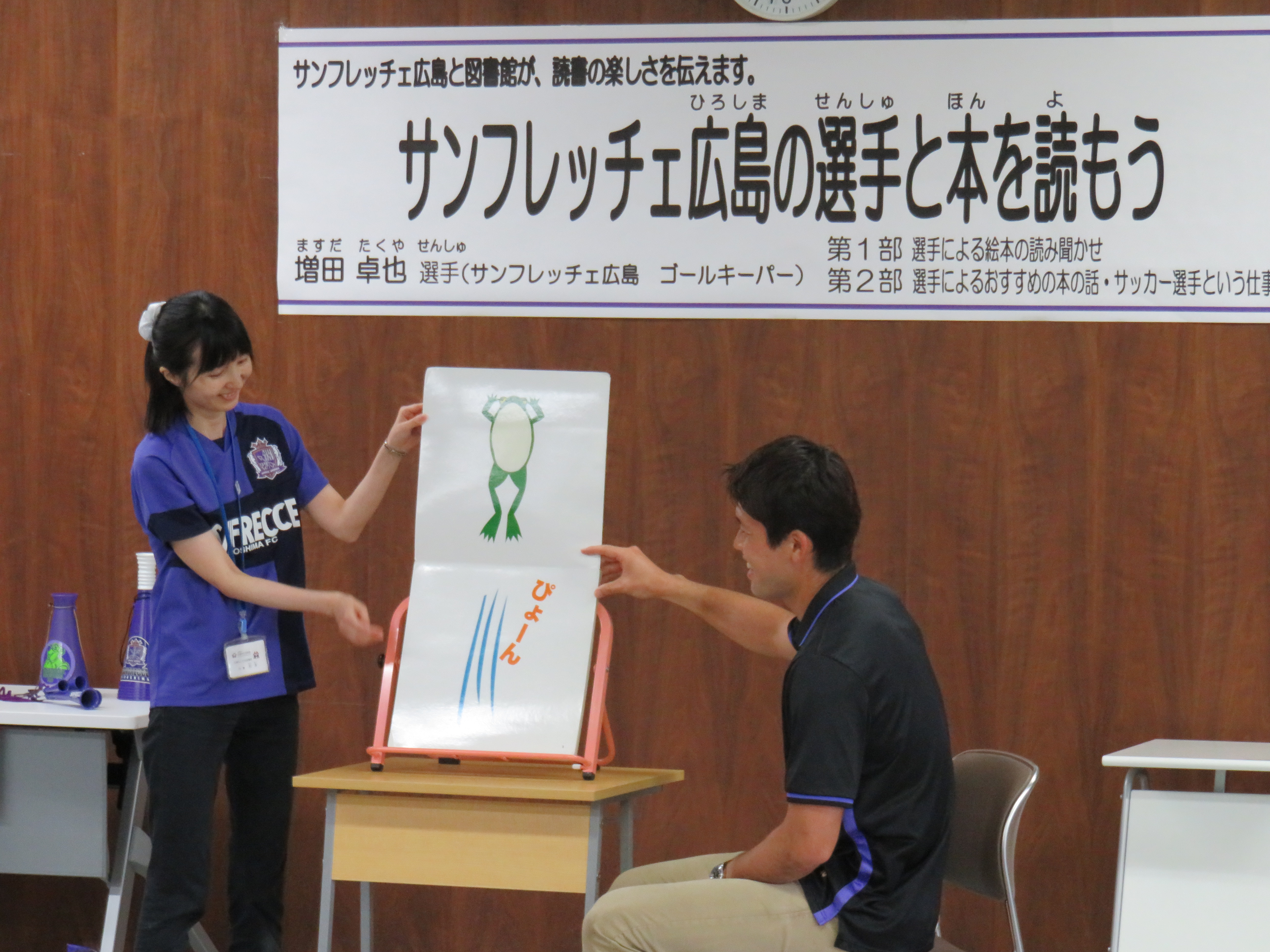 平成28年6月5日、広島市立中央図書館で、サンフレッチェ広島の増田卓也選手(ゴールキーパー)による絵本の読み聞かせやおすすめ本の話、サッカー選手という仕事についてお話いただきました。リラックスした雰囲気のなかで、増田選手を身近に感じながら、本を読む楽しさが伝わってくる催しでした。